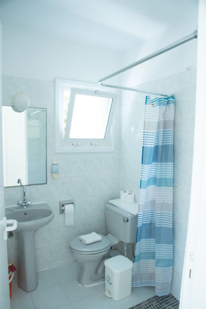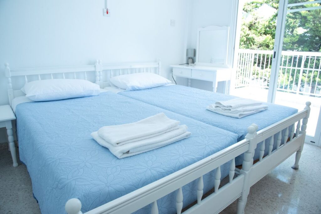 Each apartment includes two single beds or a double bed in the bedroom, and one sofa-bed that unfolds into a double bed in the combined kitchen and living area. These rooms are connected by a small hallway, giving the apartment a more open, residential feel and offering added privacy between the sleeping and living spaces.